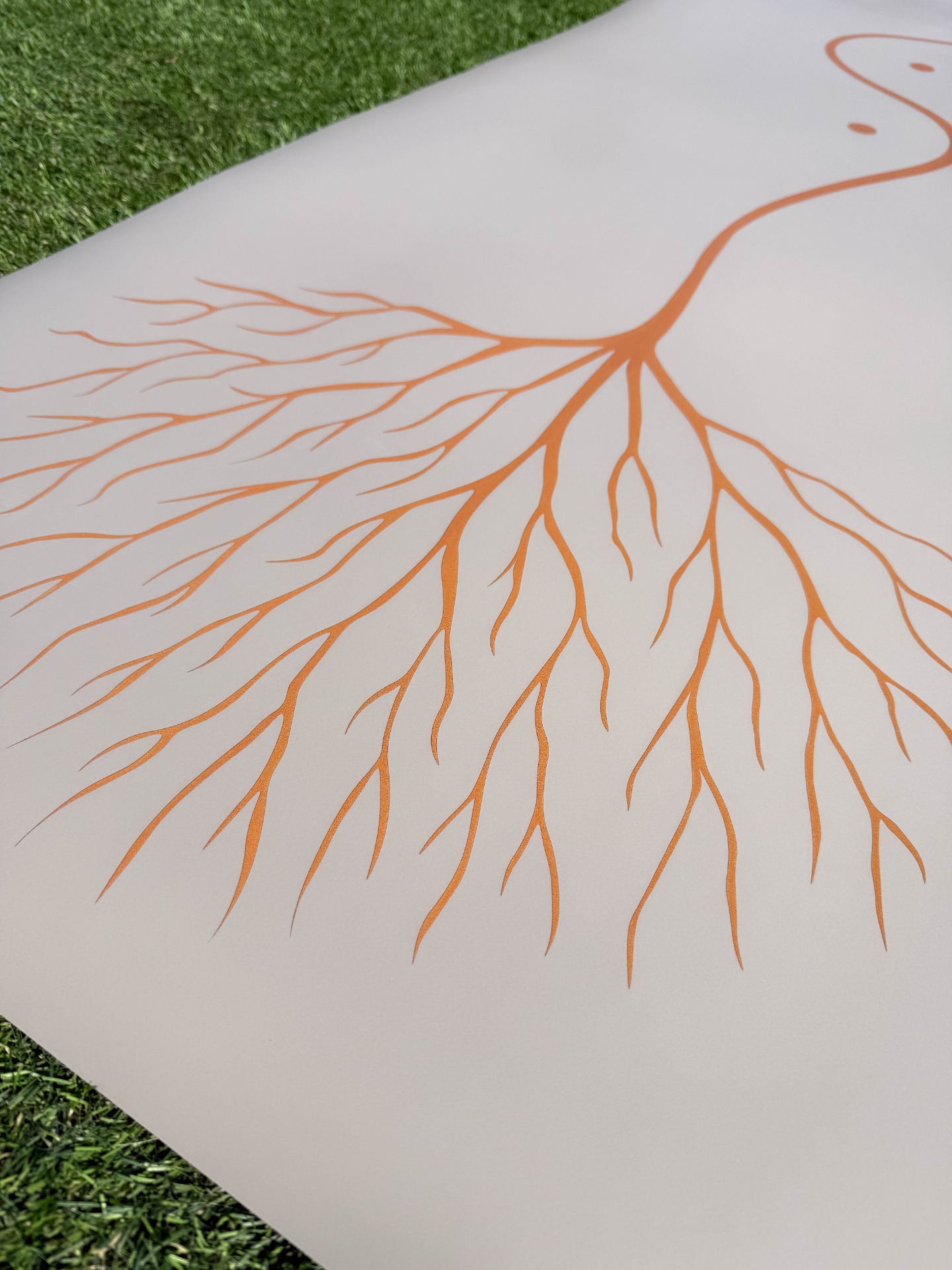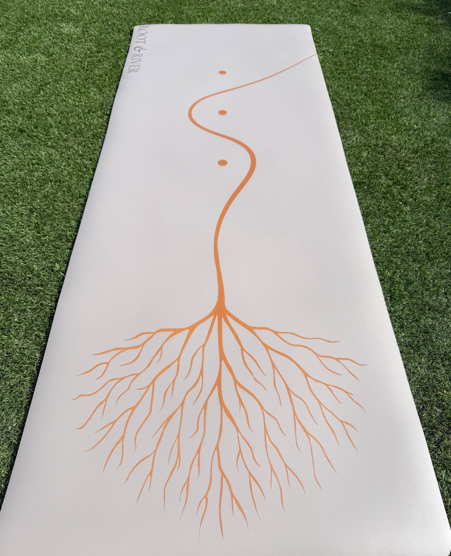 A mat of quiet purity. Inspired by the sacred river, its soft taupe base evokes clarity and renewal. Grounded yet fluid, it invites calm presence and a sense of spacious breath.
